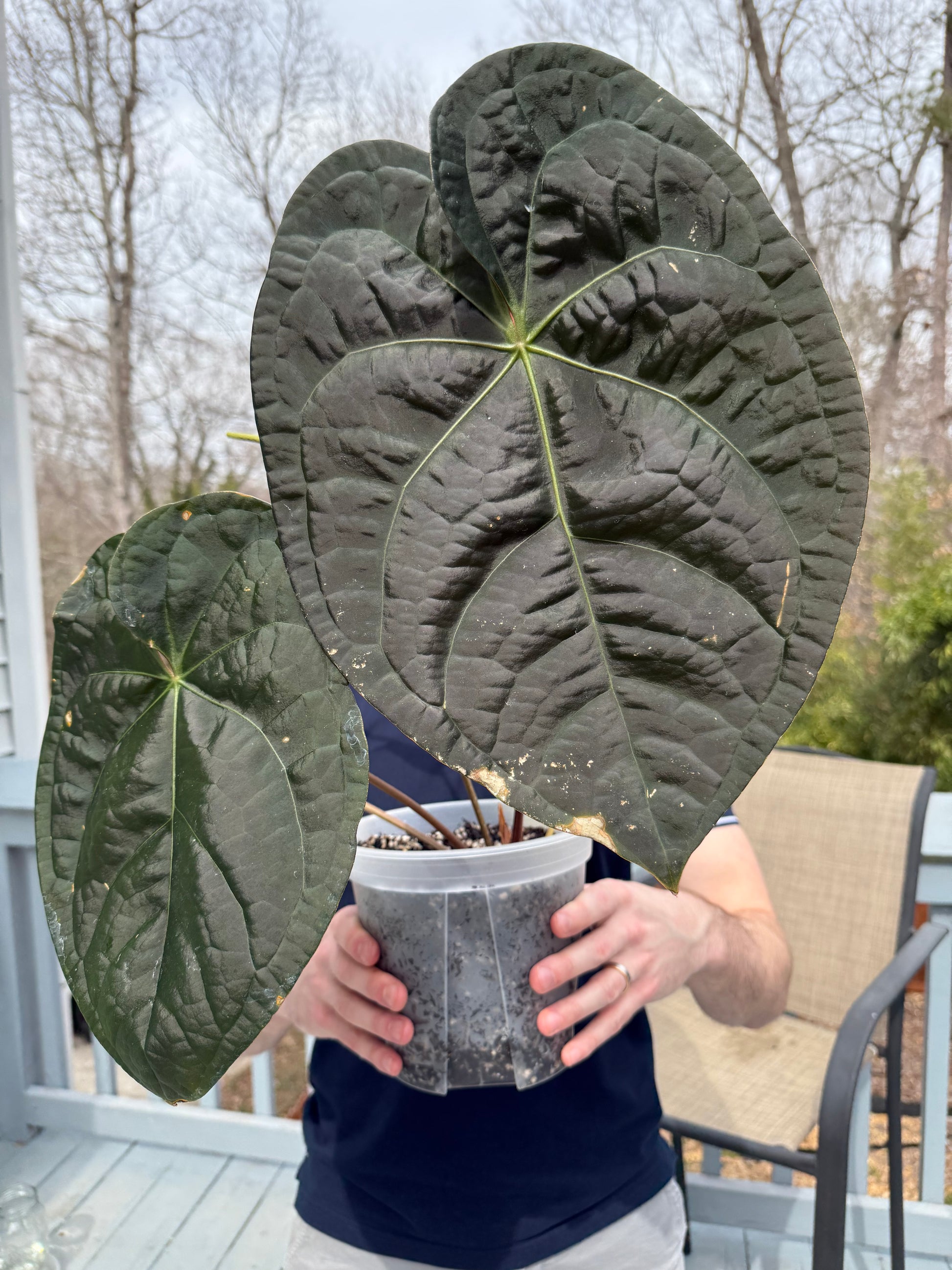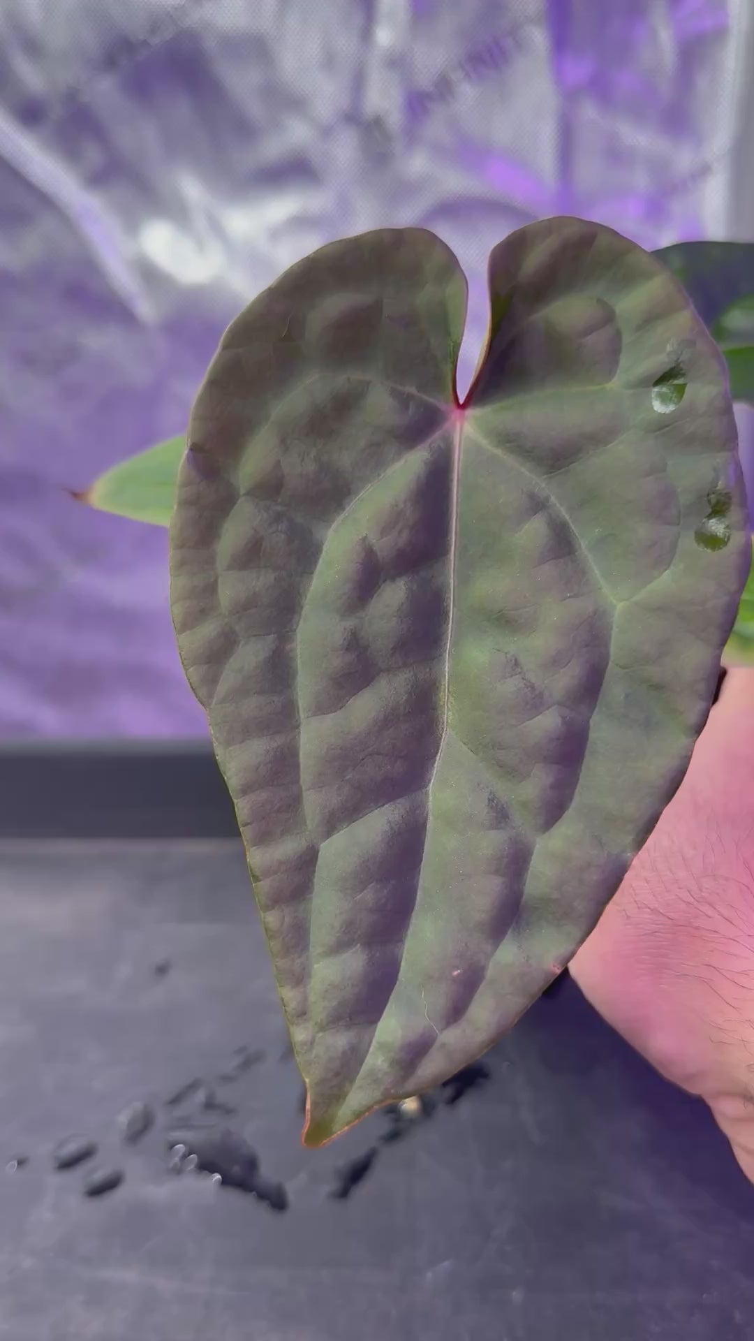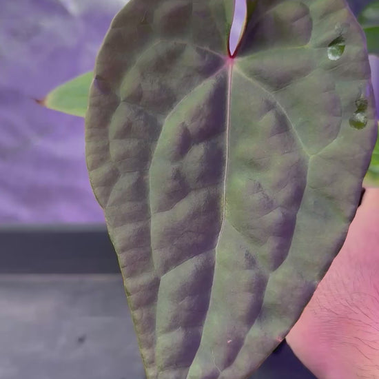 Anthurium Demon (Forgetti x Carlablackiae ‘Amanda’): This hybrid boasts a beautifully fused sinus, super prominent veins, and a deep velvety texture. Despite its dramatic appearance, it is a remarkably easy grower with robust health.